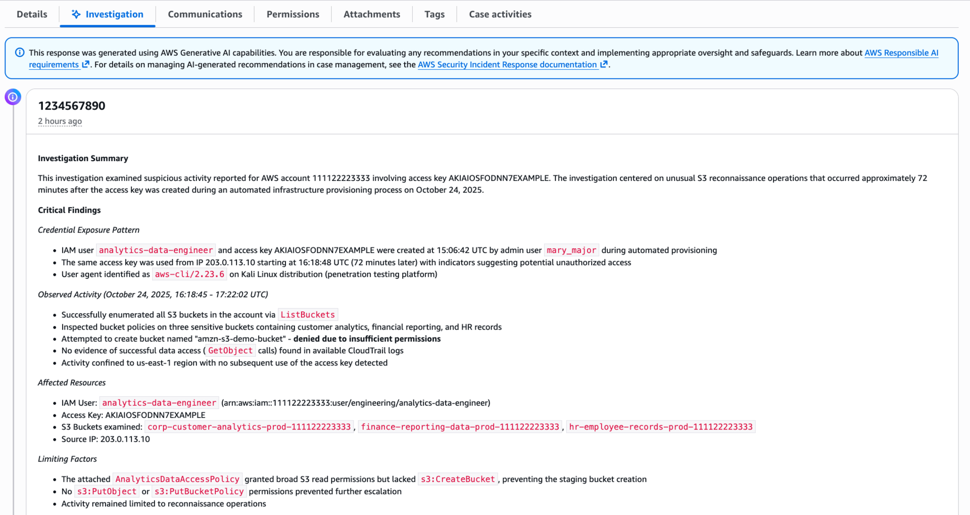 AWS has added an "investigative agent" to its Security Incident Response service. When you create a case (manually or triggered from GuardDuty/Security Hub), the agent asks clarifying questions (which credentials? what timeframe? which account?), then automatically queries CloudTrail logs, pulls IAM configurations, checks EC2 instance details, and analyzes cost patterns for anomalies. Minutes later, you get a summary with critical findings, an events timeline, and affected resources—ready for containment decisions or escalation to AWS CIRT.